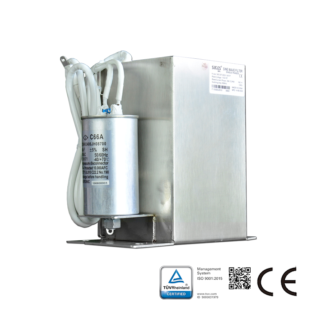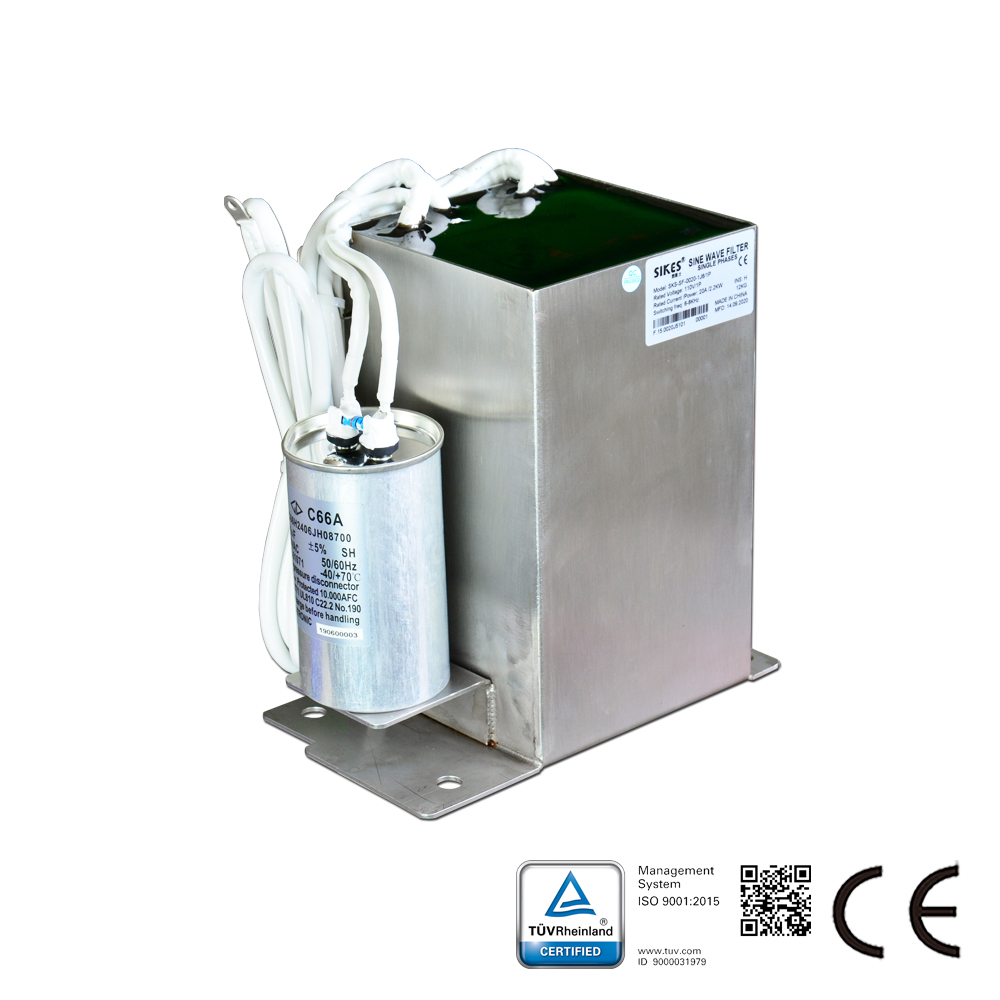 10. طريقة فعالة لحل المشكلات المذكورة أعلاه هي تركيب مرشح موجة جيبية على جانب خرج العاكس لتصفية موجة تعديل SPWM إلى شكل موجة جهد مشابه للموجة الجيبية. يتكون مرشح الموجة الجيبية من مفاعل مخرج عالي التردد ودائرة RC ومفاعلات وضع مشترك. يمكنه قمع فقد التردد العالي وتداخل dv/dt الراديوي بشكل فعال، وإطالة الكابل بين المحرك والعاكس إلى 500 متر، أو حتى 2 كيلومتر.